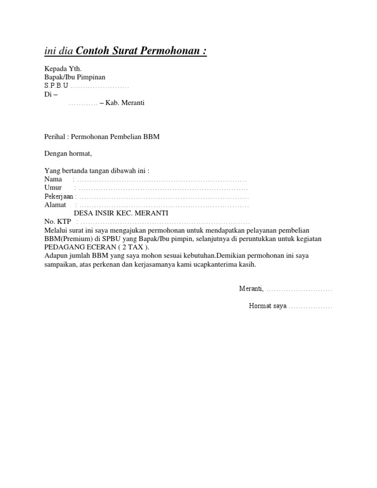 Surat Permohonan Pembelian Bbm / Contoh Surat Pembelian Bensin Contoh Surat / Surat permohonan sendiri bersifat resmi sehingga memiliki peluang yang besar untuk diwujudkan terutama dalam dunia kedinasan.. Petugas memberikan surat rekomendasi yang sudah dilegalisir kepada. Surat rekomendasi pembelian bbm nomor : Ok rumah yang aku beli ni adalah rumah ppa1m pertama kat perlis, rumah double storey dan ditawarkan pada harga rm 238. Salah satu caranya adalah dengan memberikan beasiswa kepada siswa atau mahasiswa tertentu. Ada banyak bentuk surat permohonan diantaranya, surat permohonan dana, surat permohonan izin cuti, surat permohonan kerjasama, surat setelah mengetahui beberapa hal penting dalam pembuatan surat permohonan liputan6.com telah rangkum beberapa contoh surat permohonan.